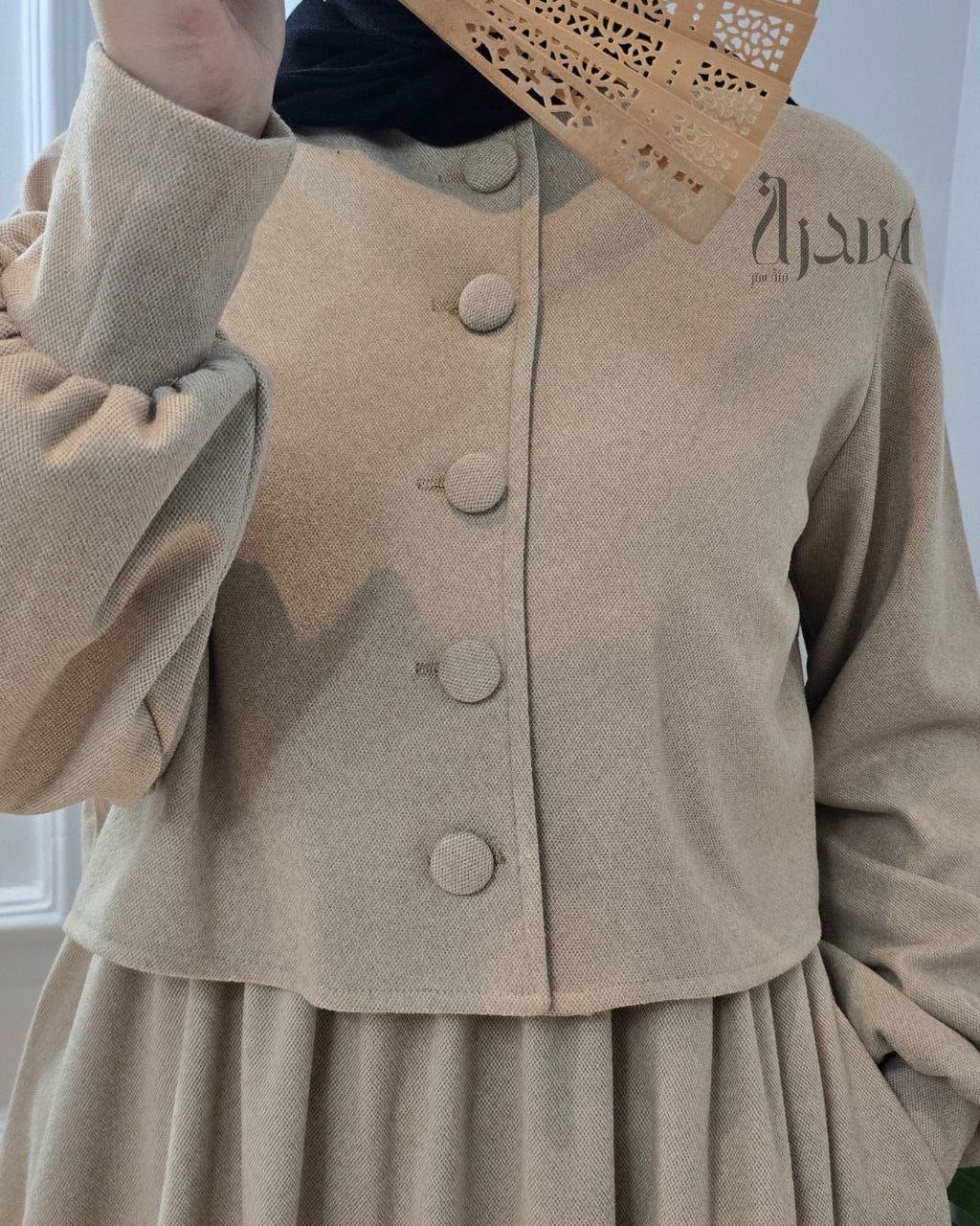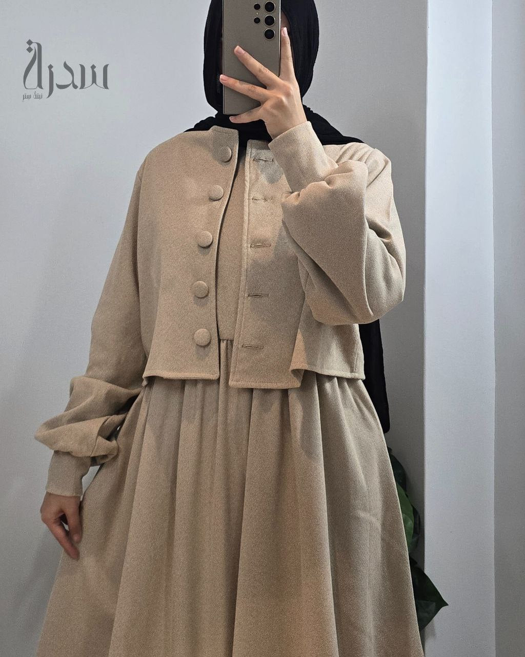 The set comes in two pieces: a sleeveless dress with pockets and a cropped jacket — you can wear them together or style each piece separately.