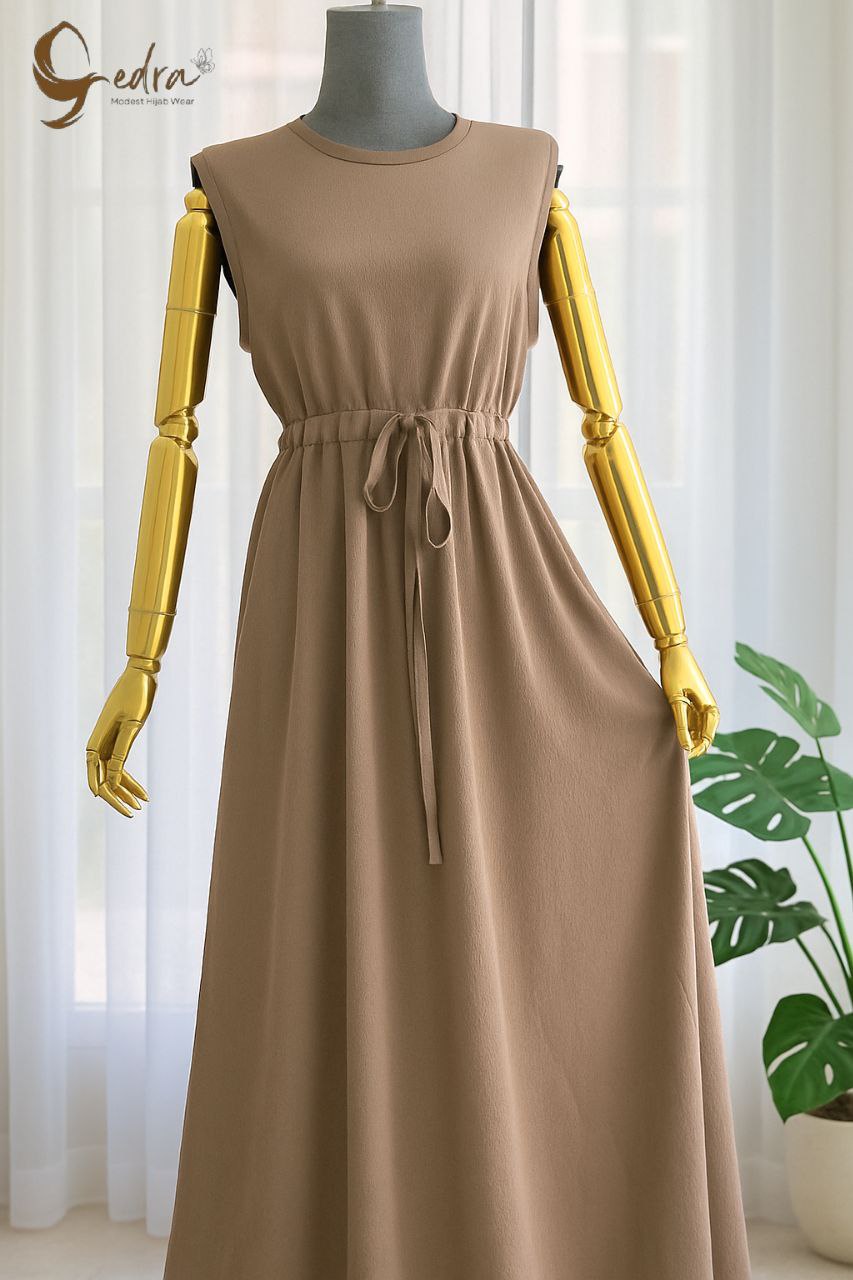 Basic sleeveless dress made of soft, comfortable fabric with a waist belt for adjustable fit